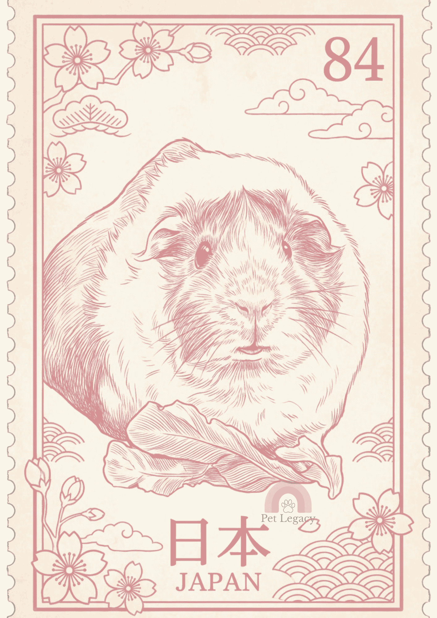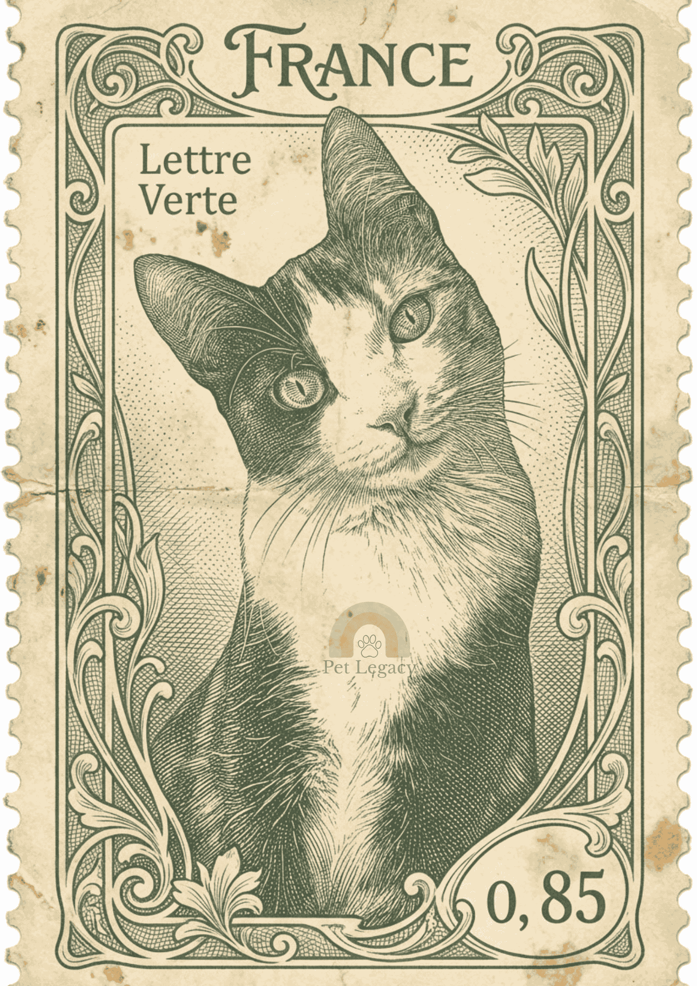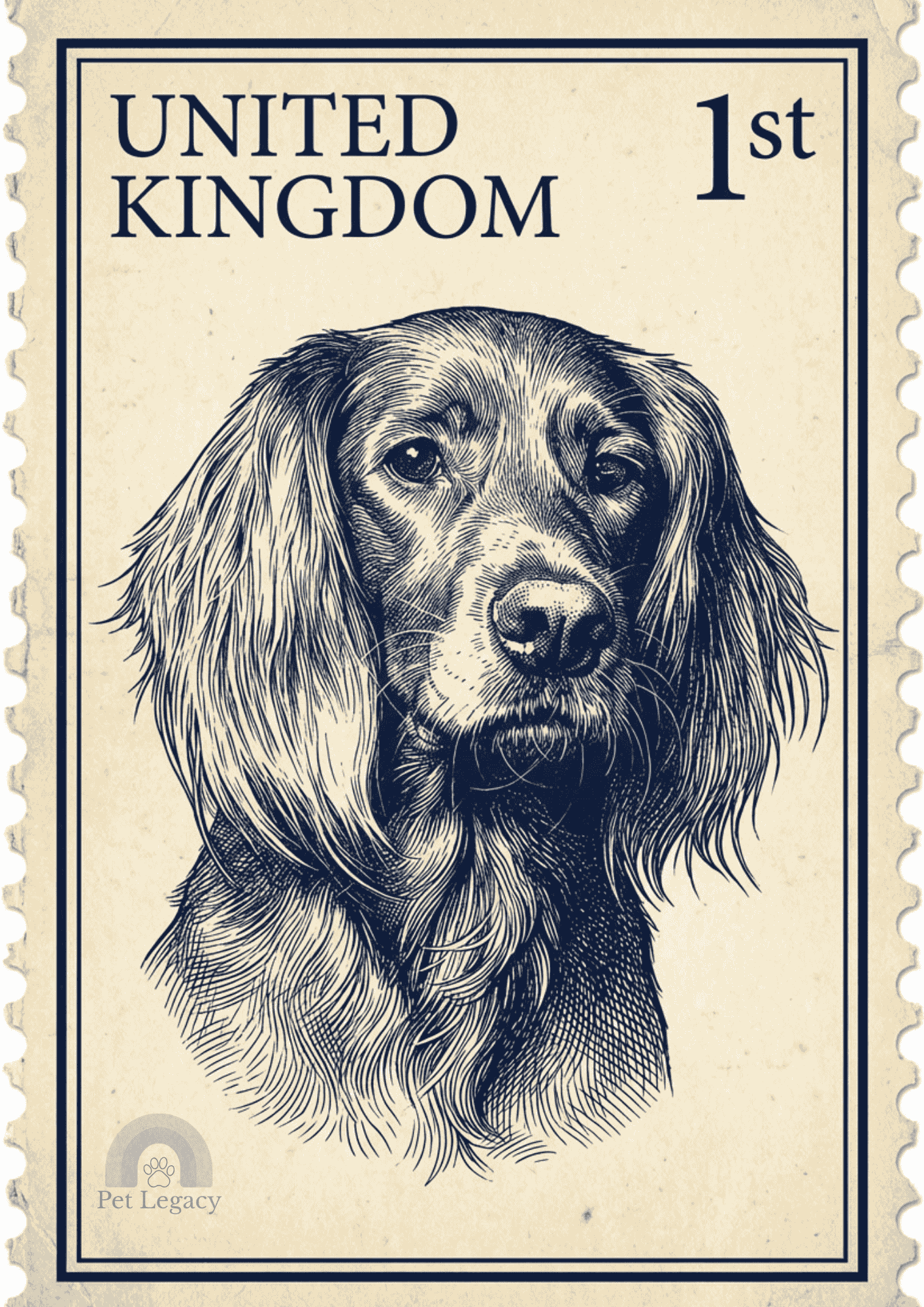 Your pet is illustrated as though featured on a collectible stamp, complete with period texture, perforated edges, and a stylised border.