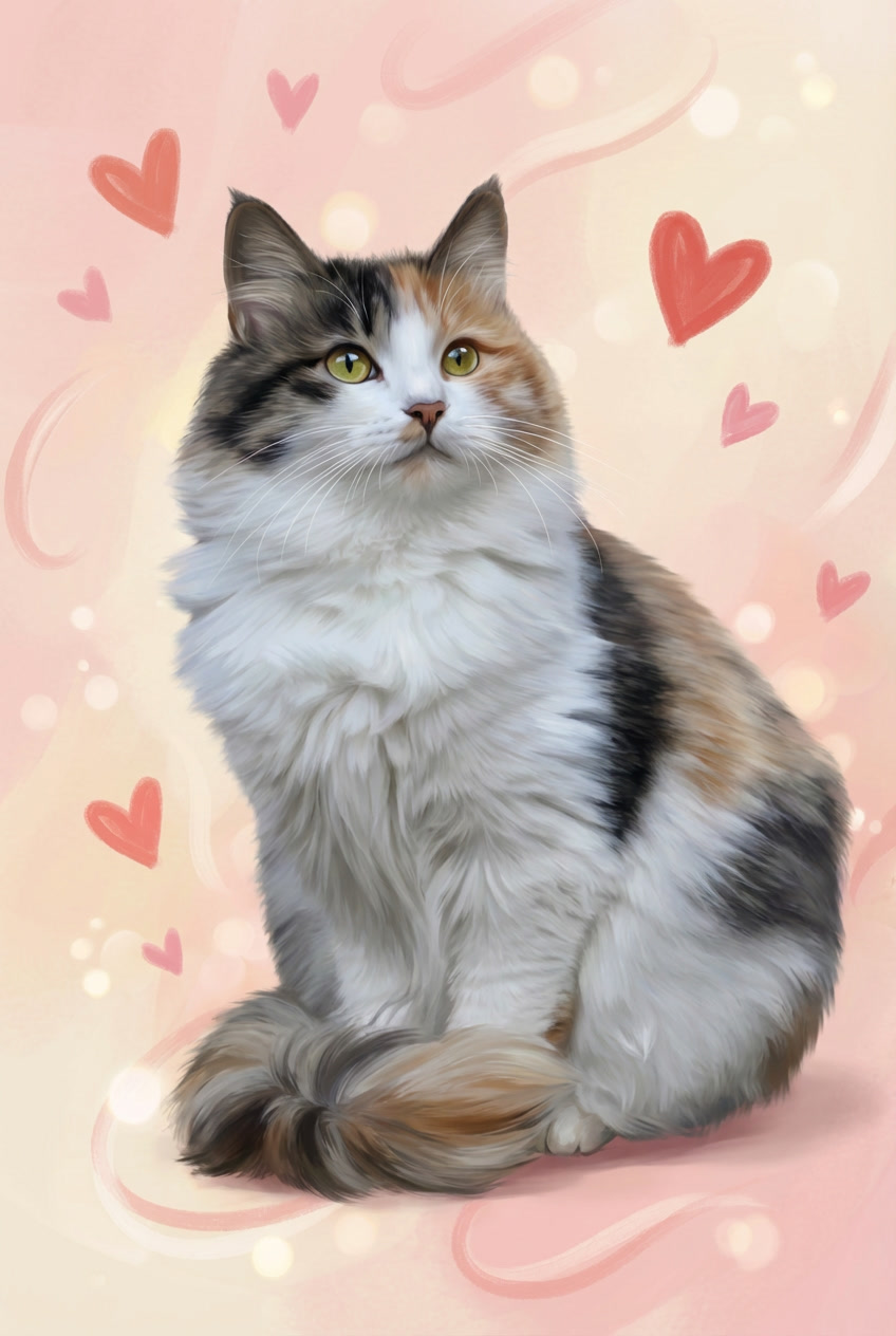 You upload your pet’s photo, and I create a Valentine-themed digital portrait using modern digital tools,